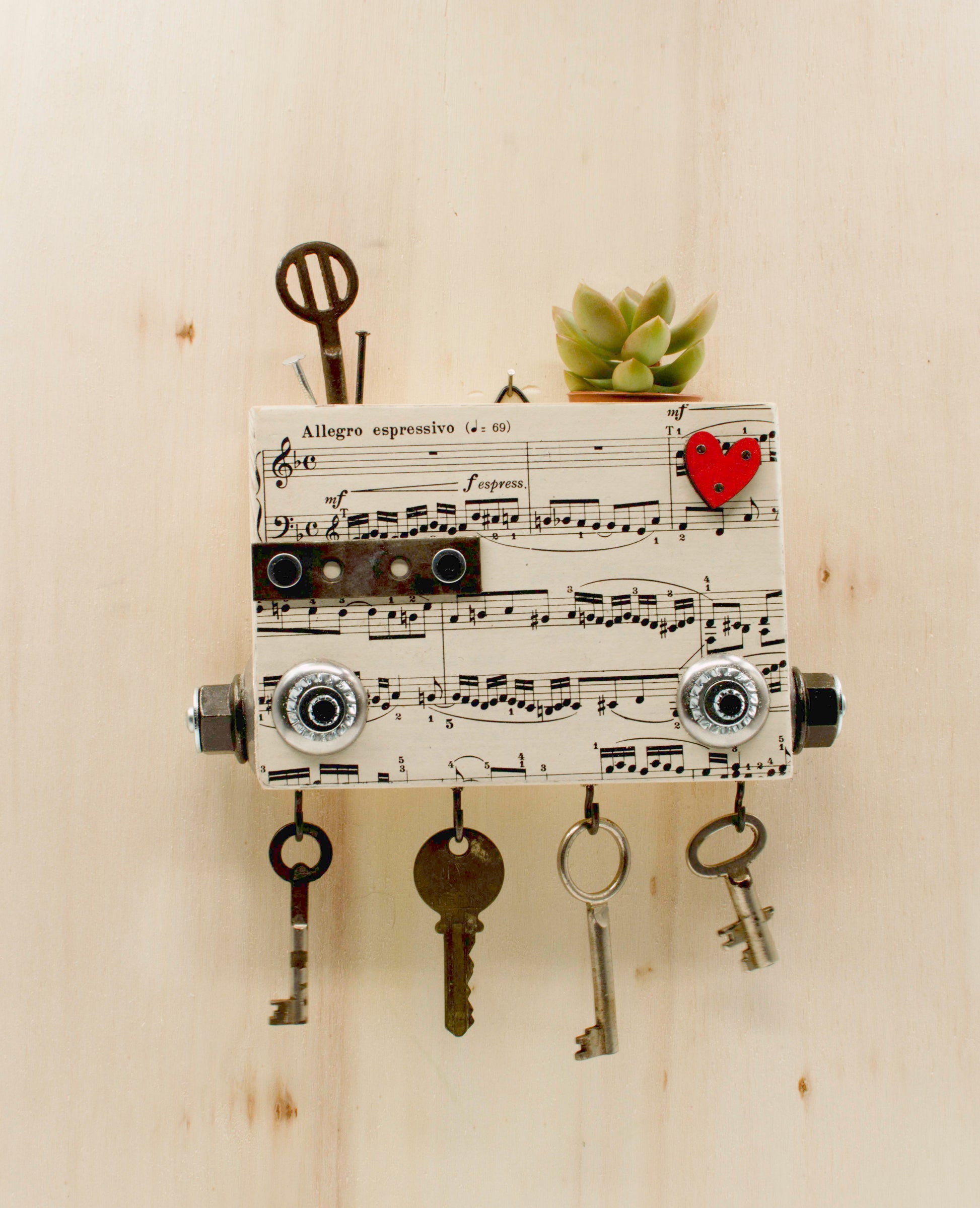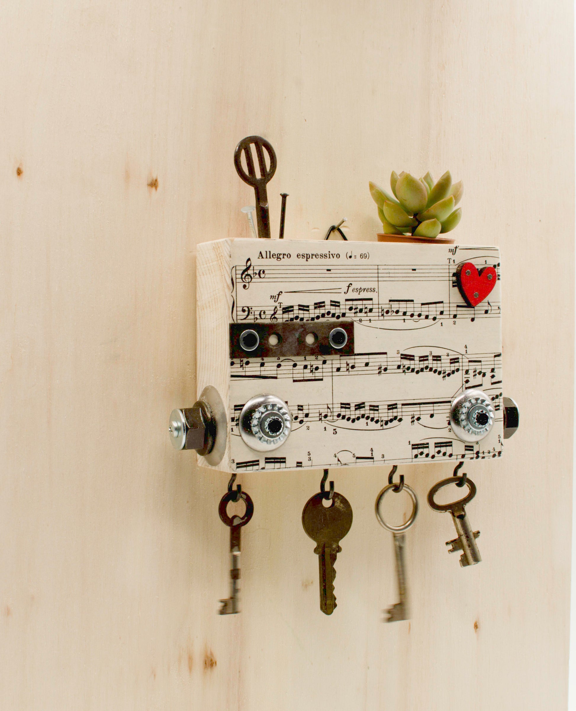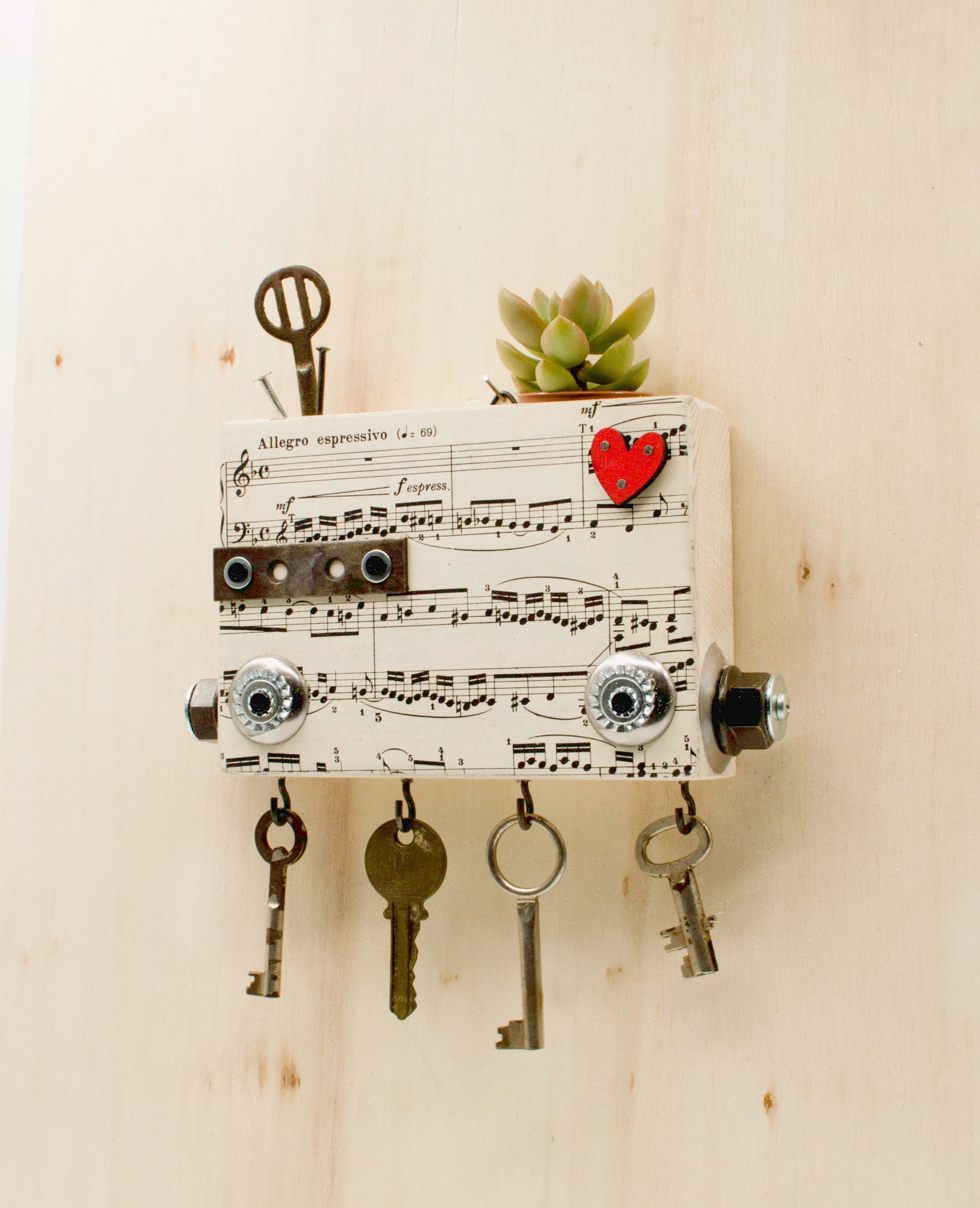 Il portachiavi Robot è in legno di abete naturale colorato e decorato con materiali di recupero.